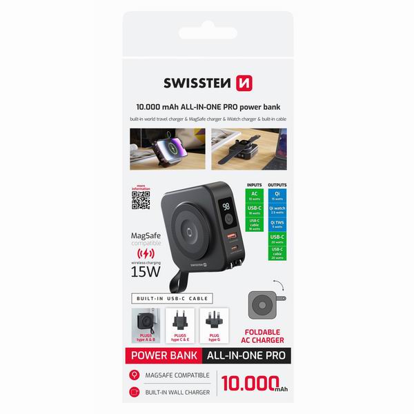 SWISSTEN, Power Bank, ALL-IN-ONE PRO, Li-Pol, 5/9/12V, nabíjanie mobilných telefónov a in., 22013978, 10000mAh, USB-C kábel, 15W,