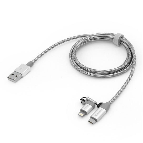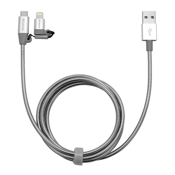 Synchronizačný a nabíjací kábel Verbatim 2 v 1 umožňuje nabíjať a prenášať dáta pre zariadenie Apple a zariadenia s konektorom USB Micro B jedným káblom. Vynikajúci na cesty, pretože vďaka výmennému konektoru nie sú potrebné dva káble.