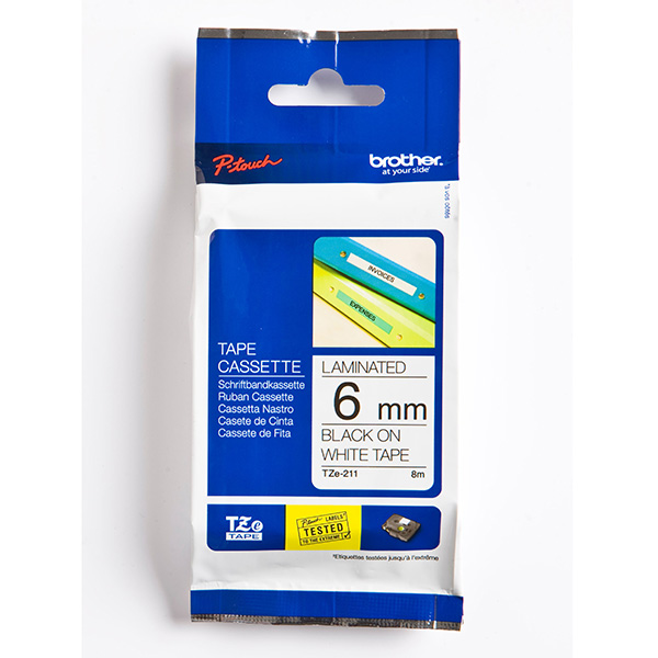 Brother originál páska do tlačiarne štítkov, Brother, TZE-211, čierny tlač/biely podklad, laminovaná, 8m, 6mm