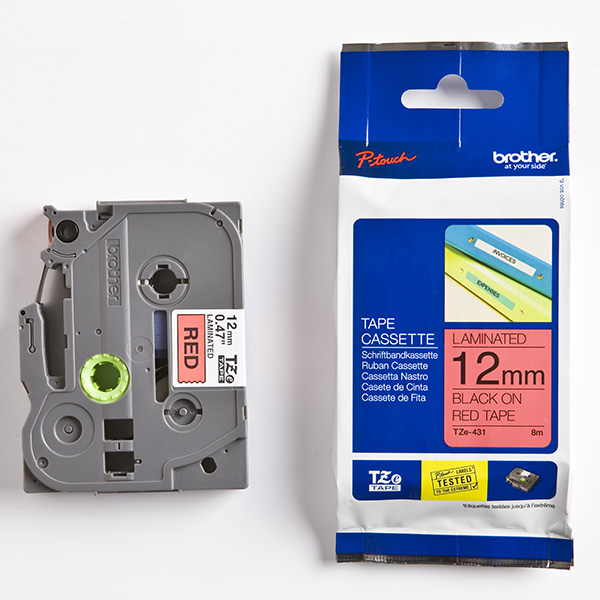 Brother originál páska do tlačiarne štítkov, Brother, TZE-431, čierny tlač/červený podklad, laminovaná, 8m, 12mm