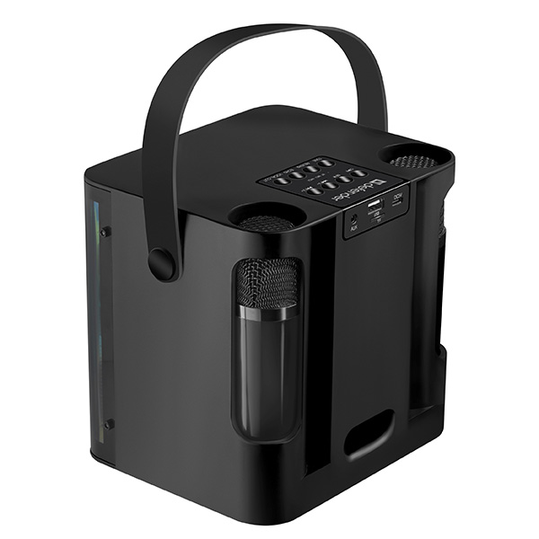 priateľmi v nezabudnuteľný zážitok. Mikrofóny sú ľahké, pohodlne sa drží a ľahko sa prepoja s reproduktorom bez zbytočných káblov. Karaoke režim navyše ponúka jasný a kvalitný prenos hlasu, takže si pripadáte ako na skutočnom