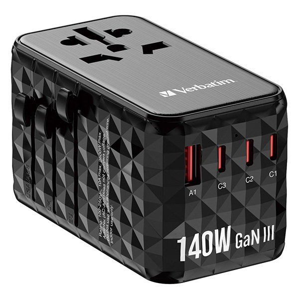 Verbatim, Cestovný adaptér univerzálny UTA-10 GaN III 2x USB-C PD a QC 4+, 1x USB-C PD 3.0, 1x USB-A QC, čierny, 140 W, poškodený