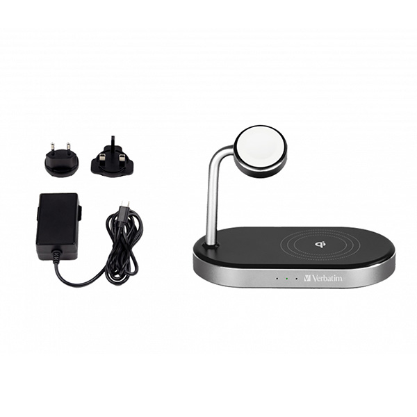 Verbatim, Nabíjací stojan 3 v 1, pre iPhone a hodinky Apple Watch, čierna, 15V, 44W, Certifikácia MFi a Qi, DOPREDAJ