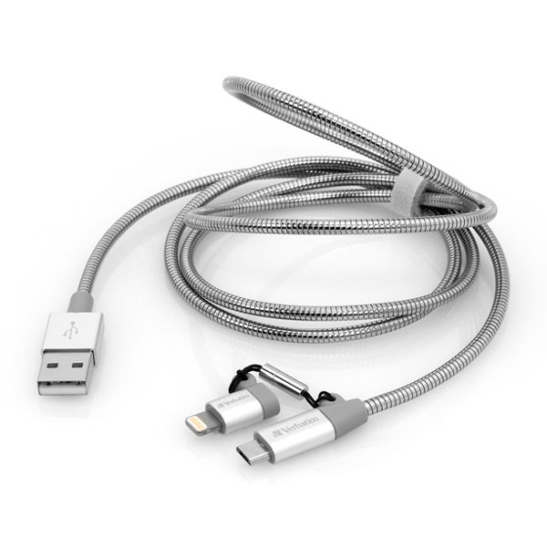 Synchronizačný a nabíjací kábel Verbatim 2 v 1 umožňuje nabíjať a prenášať dáta pre zariadenie Apple a zariadenia s konektorom USB Micro B jedným káblom. Vynikajúci na cesty, pretože vďaka výmennému konektoru nie sú potrebné dva káble.